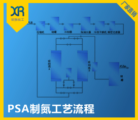 經(jīng)壓縮凈化過的壓縮空氣(PSA裝置壓力為P=0.6MPa)流經(jīng)裝有碳分子篩(CMS)的吸附塔,壓縮空氣自下而上流經(jīng)吸附塔,其間氧分子在碳分子篩表面吸附,氮氣則由吸附塔的上端流出進入氮氣緩沖罐。經(jīng)過一定時間吸附后,塔中碳分子篩被所吸附的氧飽和需進行再生,再生是通過停止吸附、降低吸附塔中的壓力來實現(xiàn)的。兩個吸附塔交替進行吸附和再生,從而確保氮氣的連續(xù)產(chǎn)生。